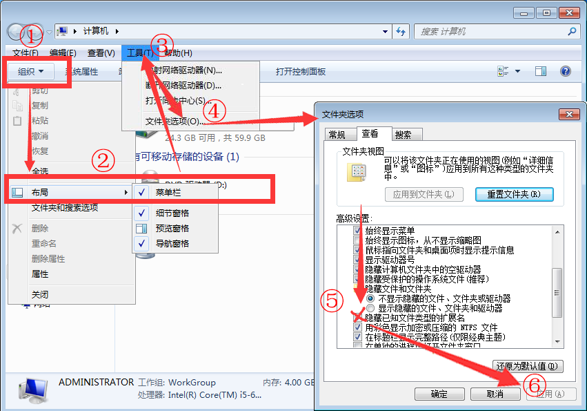 选择组织--布局,把菜单栏勾选上;然后点击工具--文件夹选项,把隐藏已知类型文件的扩展名的√去掉。